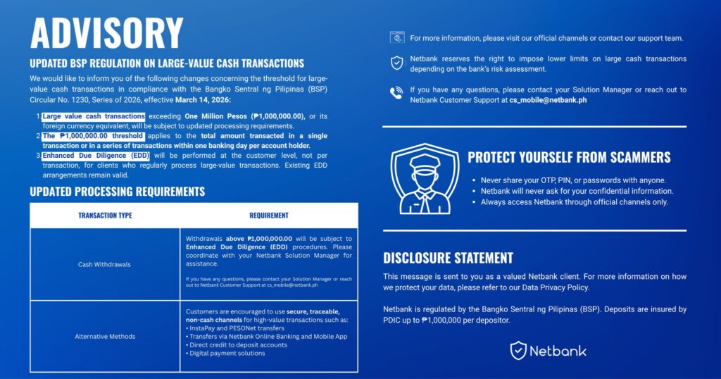 To ensure the continued security of your accounts and stay aligned with BSP Circular No. 1230, we are implementing new processing requirements for cash transactions exceeding ₱1,000,000.00.